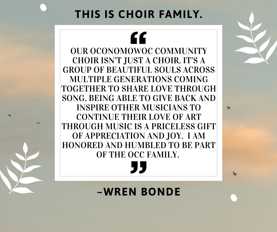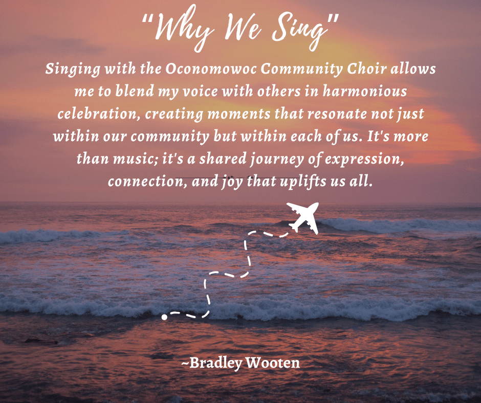 The Oconomowoc Community Choir has been sharing the love of music in the Lake Country area for over 25 years. As a non-auditioned choir, we form a welcoming group of 50 talented and enthusiastic (usually both at the same time!) singers. Our members’ ages range from middle school students to seniors.