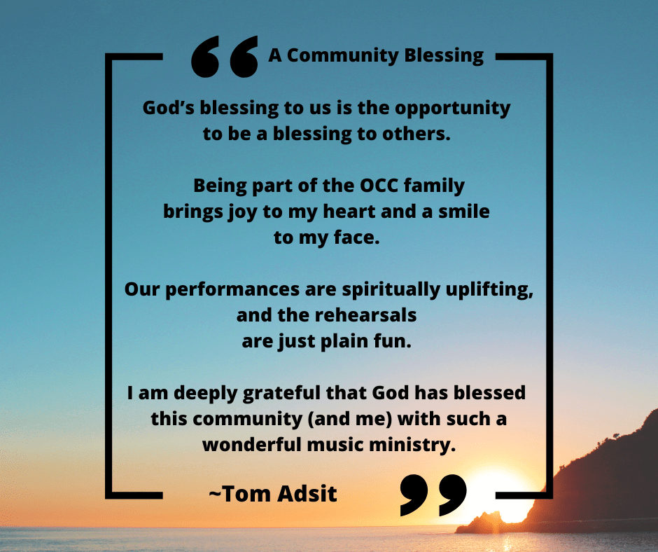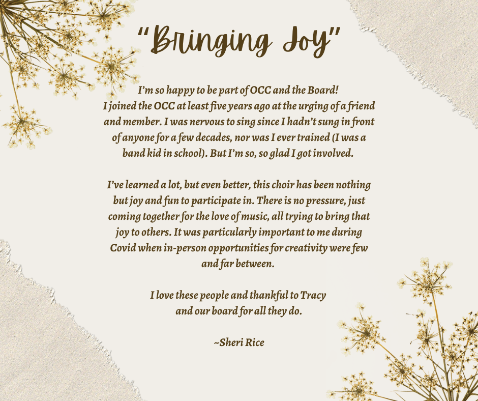 We begin each year with our Fall/Christmas Session, with a blend of traditional and new Christmas/Winter music. During the holiday season, the OCC spreads seasonal joy throughout the community by performing at various sing outs throughout the Lake Country Community.