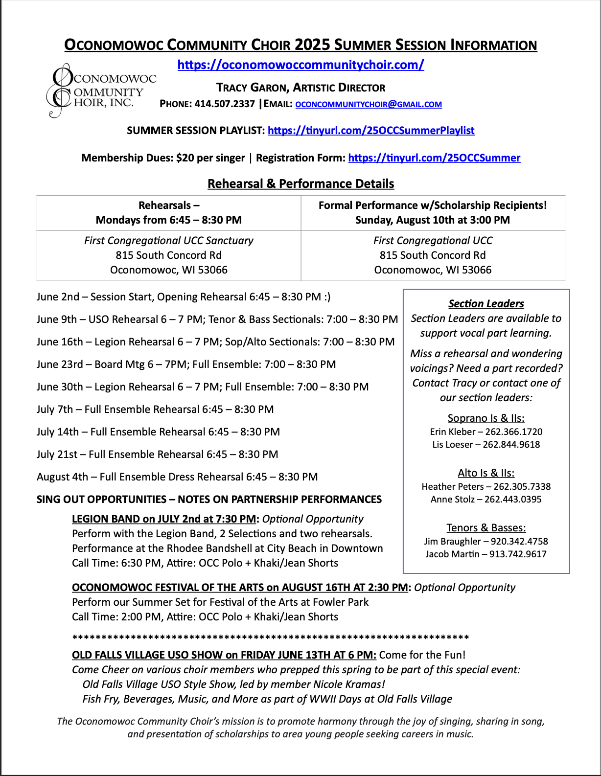 We are excited to begin our Fall/Christmas session on Monday, September 15th at First Congregational UCC in Oconomowoc from 6:45 – 8:30 PM. Our selections will be part of our theme, “That’s Christmas to Me,” filled with traditions of past and newer anthems to bring you into the Christmas spirit.